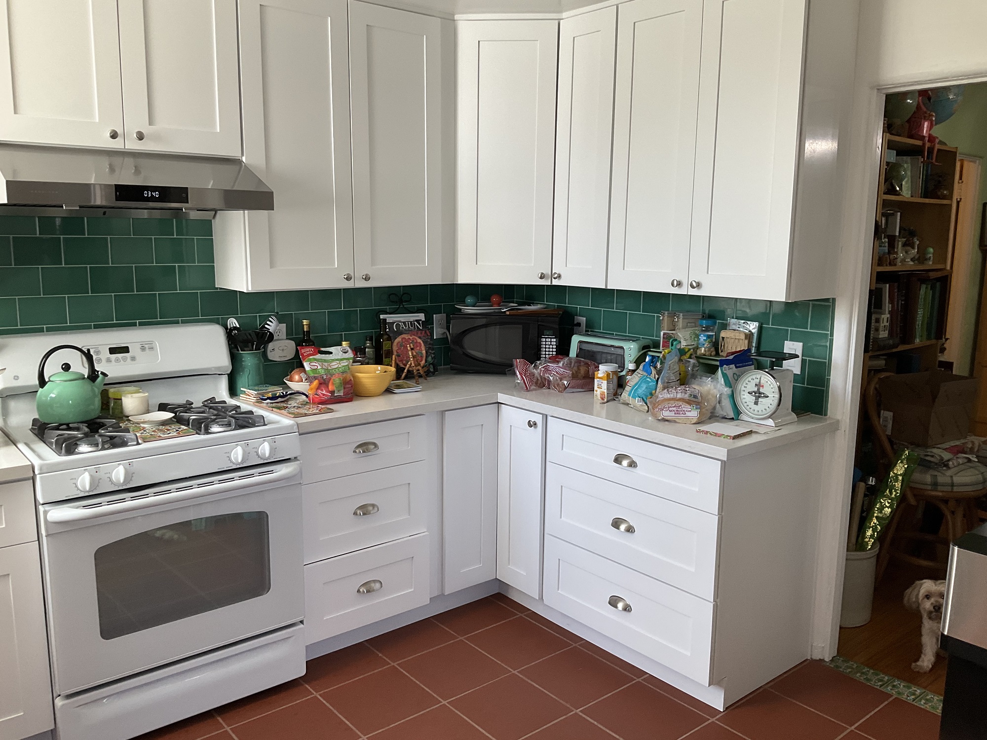 Kitchen again, after our remodel in summer 2024,with the door to the dining room on the right.Scroll down for the previous, old view.